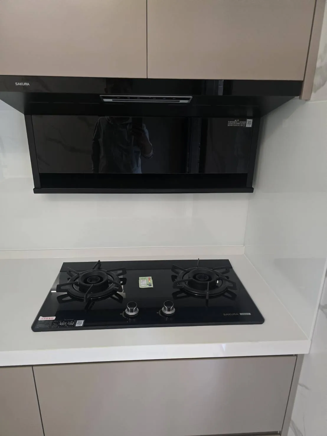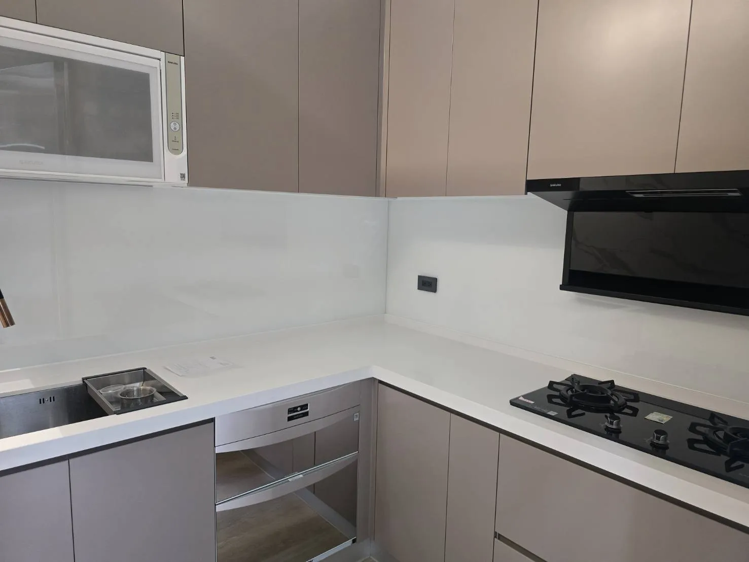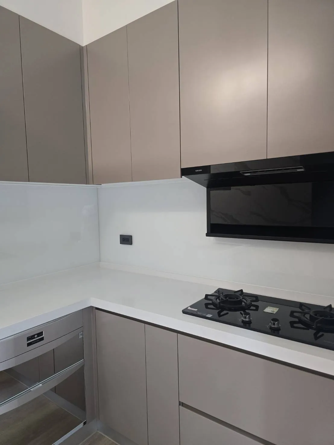 材質介紹: 桶身: 木芯板桶身 門板: 霧面結晶門板 M02 五面 台面: 賽麗石CS-601 高身櫃 配件介紹: 櫻花雙口玻璃爐台 G2922G 櫻花排油煙機 R-7302 櫻花烘碗機 Q-7592B. Q-7565