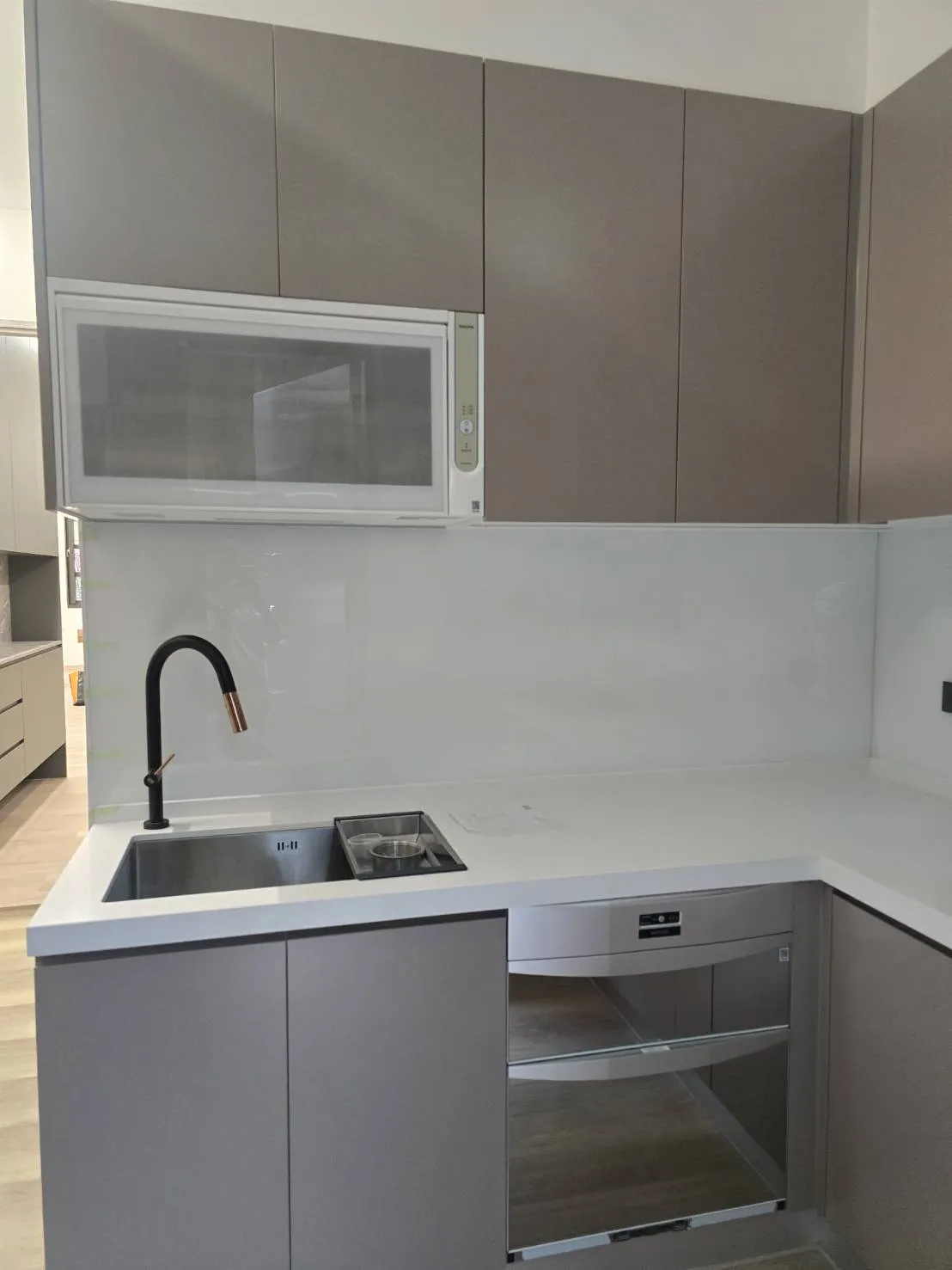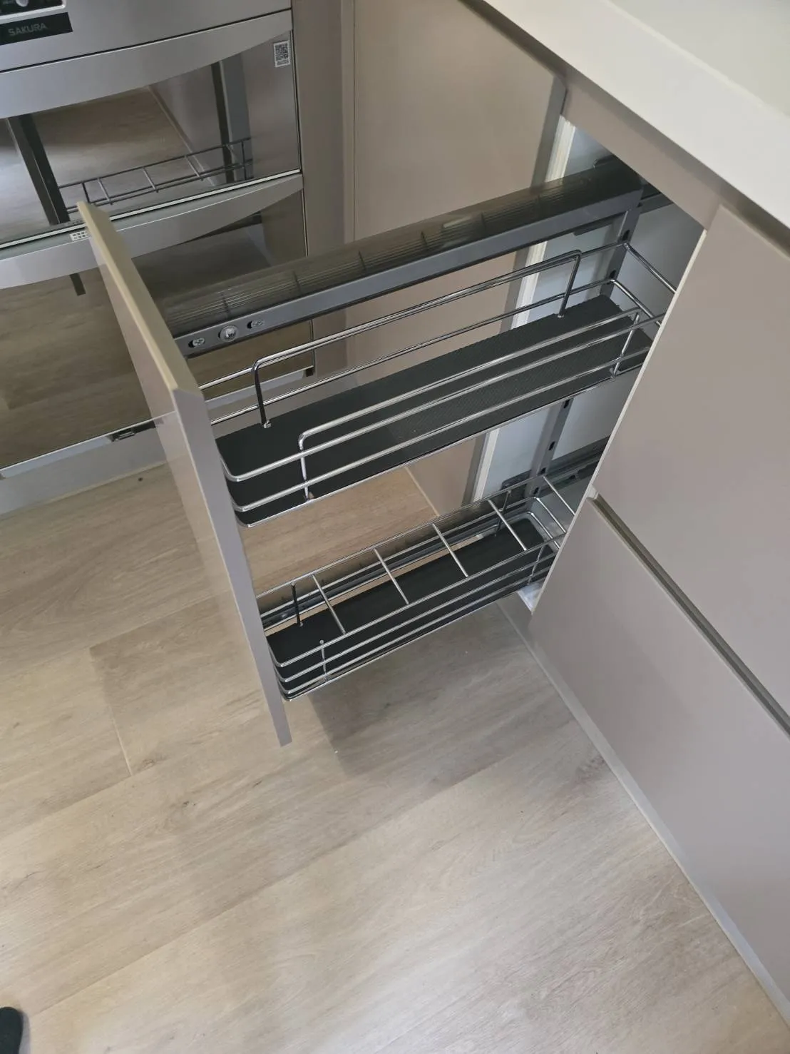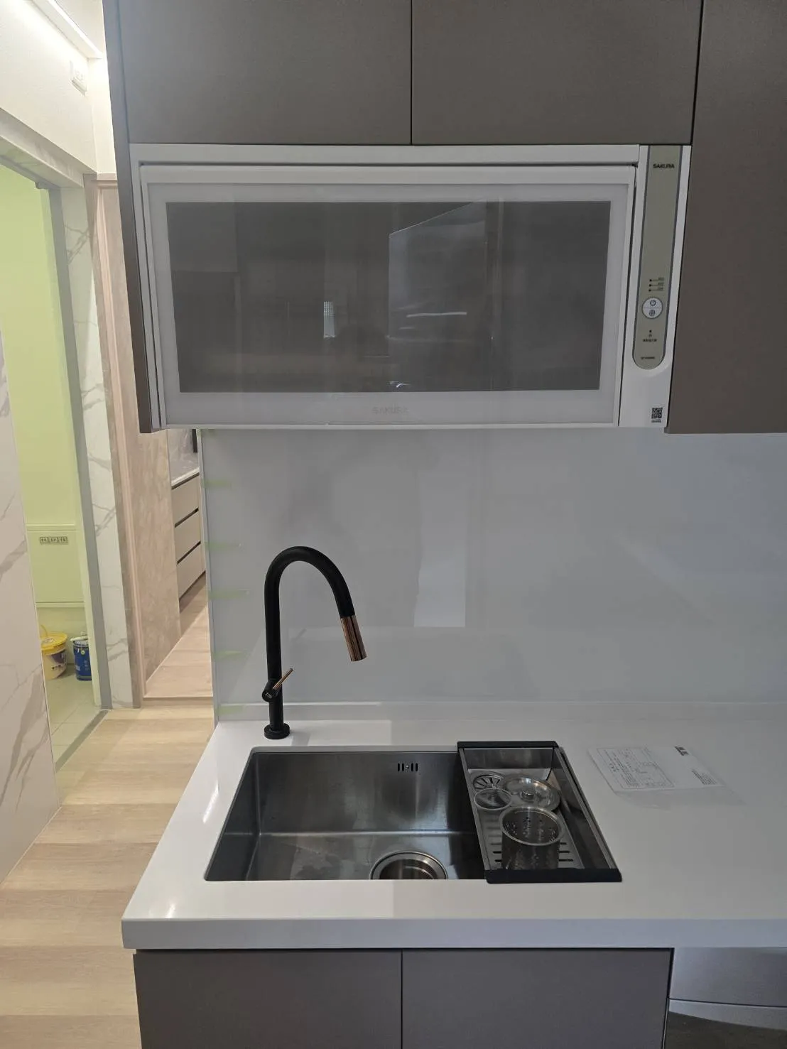 材質介紹: 桶身: 木芯板桶身 門板: 霧面結晶門板 M02 五面 台面: 賽麗石CS-601 高身櫃 配件介紹: 櫻花雙口玻璃爐台 G2922G 櫻花排油煙機 R-7302 櫻花烘碗機 Q-7592B. Q-7565