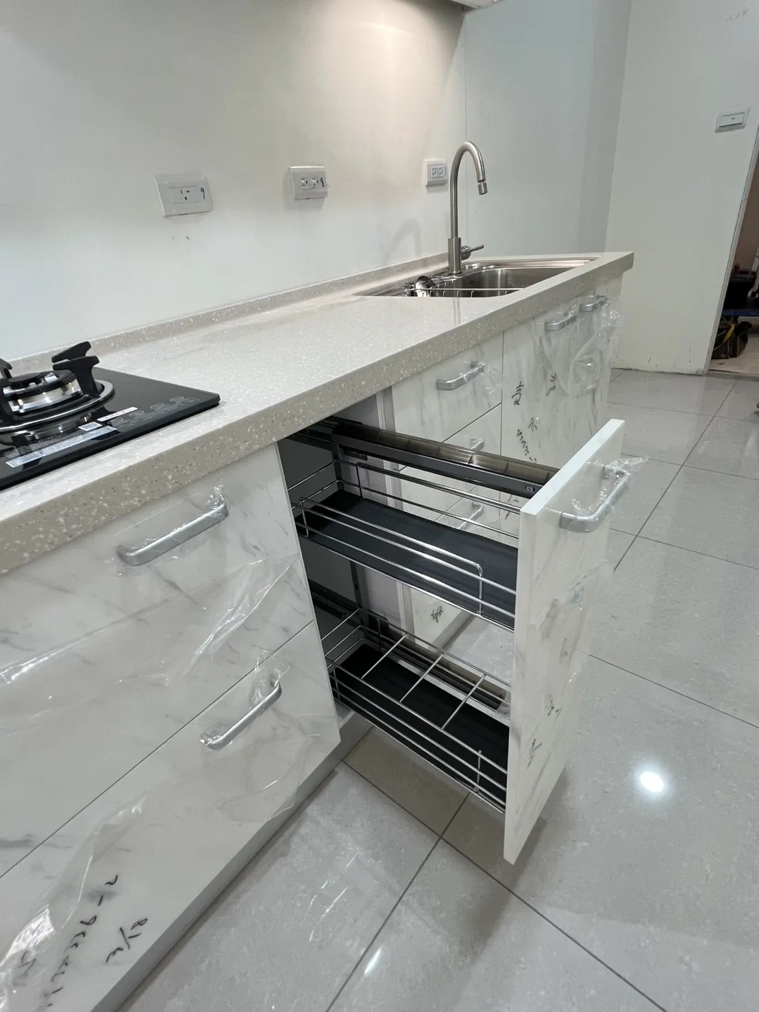 材質介紹: 桶身: 木芯板桶身 門板: 水晶門板D-735 台面: 韓國人造石PS-820 配件介紹: 櫻花爐台 G2820G 櫻花油煙機 R-3500 櫻花落地烘碗機Q-7565